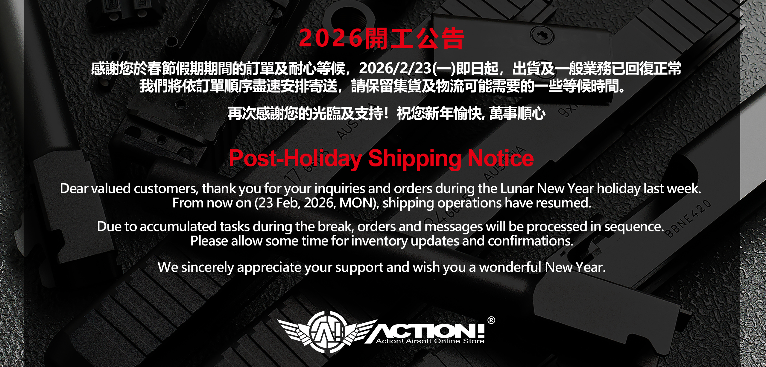 感謝您於春節假期期間的訂單及耐心等候,2026/2/23(周一) 即日起,出貨及一般業務已回復正常。