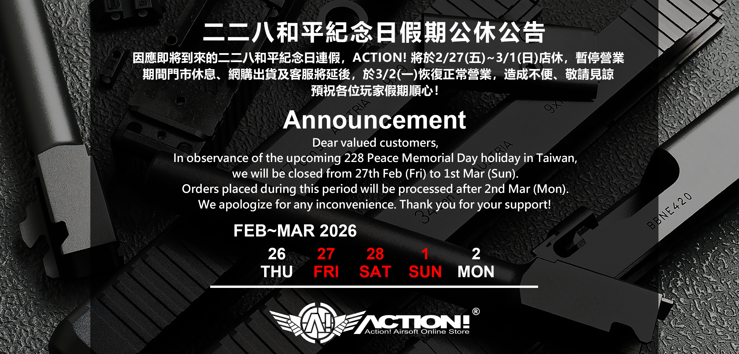 因應即將到來的二二八和平紀念日連假,ACTION! 將於2/27(五)~3/1(日)公休,暫停營業。期間網購出貨及客服將延後,於3/2(一)恢復正常營業,造成不便、敬請海涵。