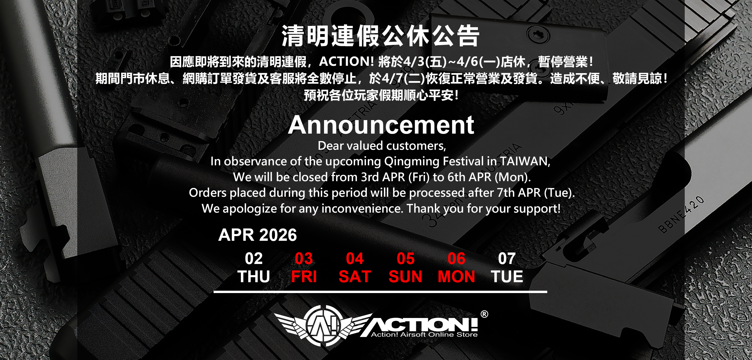 因應即將到來的清明連假,ACTION! 將於4/3(五)~4/6(一)店休,暫停營業!期間門市休息、網購訂單發貨及客服將全數停止,於4/7(二)恢復正常營業及發貨。